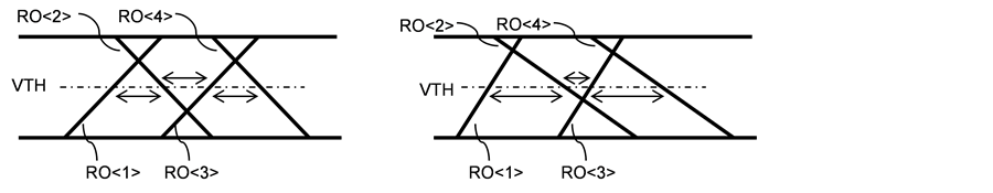 The rising and falling delay times of the inverter in the RO are designed to be equal; however, the delay time changes because of the process deviation as shown in Figure 10. An ununiform delay time causes a conversion error. This can be alleviated by shifting the logical threshold voltage (VTH). The delays are made uniform by increasing VTH in the example shown in Figure 10(b). A schematic of the latch circuit with the threshold-adjust function is shown in Figure 11. The output nodes of the regeneration latch OR, OL are precharged to