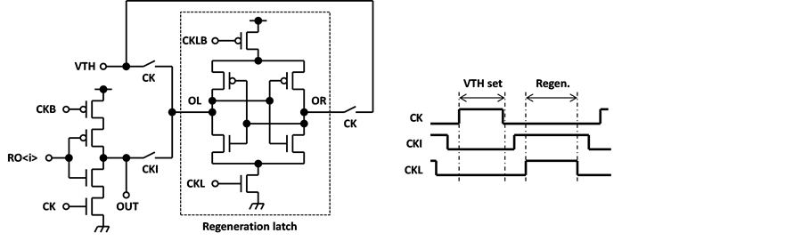 VTH in the VTH set phase. Then, the RO < I > is sampled at the falling edge of CK, which is synchronized to the STOP signal. The sampled signal is transferred to theOL node, then the regeneration latch is activated; thus, the sampled voltage is compared with VTH. The automatic VTH adjustment circuit was not implemented in this version yet, and the VTH was adjusted manually. The implementation of the automatic VTH adjustment is planned for future work.
