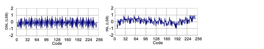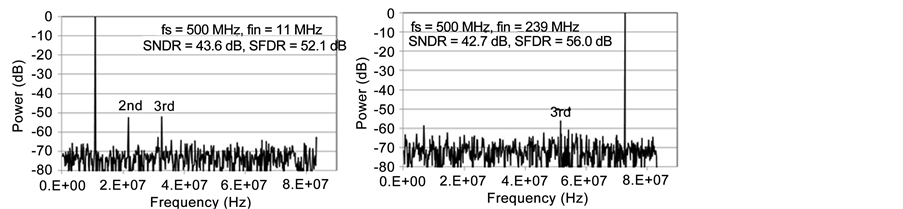 A test chip was fabricated using 65-nm digital CMOS technology to demonstrate the effectiveness of the proposed architecture. Figure 12 shows a photomicrograph and a layout plot of the test chip. The circuit area of the ADC core was 180 μm × 190 μm. The chip consumed 2.0 mW at 500 MS/s, and the supply voltage was 1 V. The chip was mounted on an evaluation board by using short bonding wire, resulting in a small parasitic inductance. The analog input signal and the clock signal were fed through SMA connectors. Figure 13 shows the measured DNL and INL. The maximum values of DNL and INL were 0.9 and 1.0 LSB, respectively. The measured sampling frequency dependencies of SNDR are shown in Figure 14. The difference between the SNDR at low and Nyquist input frequency was about 1 or 2 dB; therefore, the bandwidth exceeded the Nyquist frequency. The SNDR maintained more than 40 dB up to the sampling frequency of 550 MHz when the VDD was 1 V. The maximum operation frequency was improved to 650 MHz by increasing the VDD to 1.1 V. The measured spectra at the sampling frequency of 500 MHz are shown in Figure 15. The ADC output data
