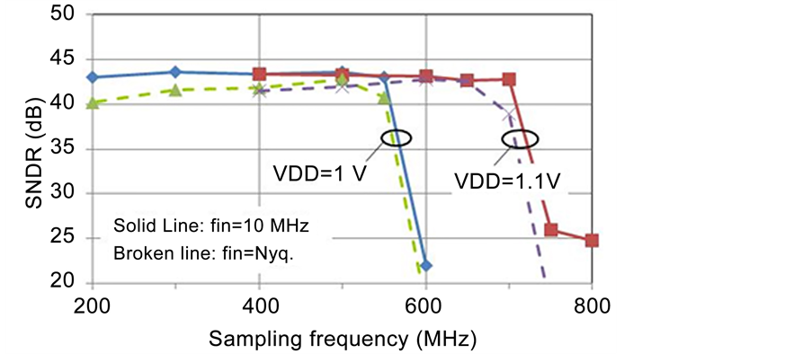 Figure 14. Measured sampling frequency dependencies of SNDR.