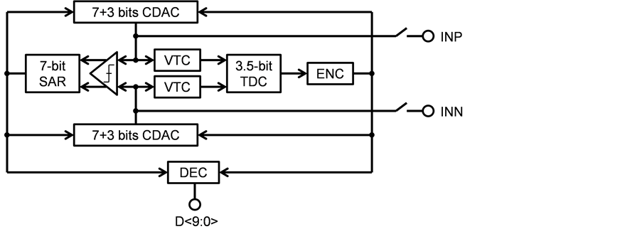 phase detector (FPD), which detects the sign of the input signal. The PFD output is used as the most significant bit of the ADC output as well as the folding signal that controls a multiplexer (MUX). This enables to halving of the input range of the TDC, whose resolution can be reduced by 1 bit. The START signal is delayed by the delay chains, and 15 time-reference signals are generated. The STOP signal is compared to the time-reference signals by the delay comparators, which generate the 4-bit digital codes. The time difference between the adjacent time- reference signals is adjusted to be evenly spaced by the variable capacitor in the delay chain. The time resolution of the TDC (tres) is approximately 3 ps, resulting in a high-speed operation of 5 GS/s. Moreover, the folding technique can reduce the power dissipation, resulting in a low-power dissipation of 21.5 mW. However, the number of the delay chains exponentially increases when the resolution increases; therefore, the power dissipation and the chip area are drastically increased. The conversion speed of the TDC also increases because the maximum delay of the delay chains is approximately 2n・tres, where n is the resolution of the TDC. Moreover, the VTC used in this work has large nonlinearity, which degrades the dynamic performance when the VTC is used in the high- resolution ADC. Therefore, this architecture cannot be used in the high-resolution ADC. Therefore, a high-resolution ADC architecture combining conventional voltage- domain processing and time-domain processing is proposed. Figure 2 shows a block diagram of a 10-bit TB-ADC using subranging architecture [11] . The coarse conversion is performed by a VTC and a TDC, and the fine conversion is performed by the successive approximation register ADC (SAR ADC). The input signal is sampled by the capacitive digital-to-analog converter (CDAC) and is then converted into the time signal by the VTC. The time signal is converted into 3-bit coarse digital code by the TDC. The residue signal is generated by the CDAC using 3-bit code and is converted into 7-bit fine code by the SAR ADC. Coarse and fine codes are combined by the digital error correction circuit (DEC). The offset error of the TDC can be corrected by the DEC; therefore, calibration is unnecessary. A low TDC resolution of 3.5 bit enables low-power dissipation. However, the sampling frequency is low (100 MS/s) because the