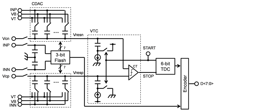 As mentioned in Section 2, the high-resolution ADC can be obtained by a combination of the voltage-domain and the time-domain processing; however, the sampling frequency is low. This is because the SAR ADC is used as the voltage- domain ADC. Therefore, we propose a novel TB-ADC architecture combining a flash ADC and a TDC. A block diagram of the proposed 8-bit TB-ADC is shown in Figure 3. The input differential signals (INP and INN) are converted into upper 3-bit digital code by the flash ADC, and then the CDAC generates the residue signals (Vresp and Vresn). The residue signals are converted into the time signals (the time difference between START and STOP), which are converted into lower 6-bit digital code. These digital codes are adjusted to obtain the digital output D < 7: 0 > by the encoder. A high conversion rate can be obtained owing to the flash coarse ADC. The TDC is used as a fine ADC because the time- domain quan tizer has a low-noise nature and a low-power dissipation compared with the conventional voltage-domain quantizer [12] . Additionally, the input range of the VTC can be reduced to 1/8 of the full-scale range, resulting in sufficient linearity even at a supply voltage of 1 V because the VTC and the TDC are used as the fine ADC.