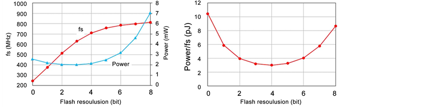 The resolution distribution to the coarse and fine ADCs is a critical challenge in this architecture. Figure 4 shows simulated relationships among the sampling frequency (fs), the power dissipation, the conversion energy (Power/fs), and the resolution of the flash ADC. The simulations are performed using 65-nm CMOS model. The simulation at a resolution of 0-bit expresses a VTC and TDC based ADC such as that in Figure 1, and that at a resolution of 8-bit expresses a pure flash ADC. The conversion time of the proposed ADC is determined by the sum of the conversion times of the flash ADC and the TDC based ADC. The flash