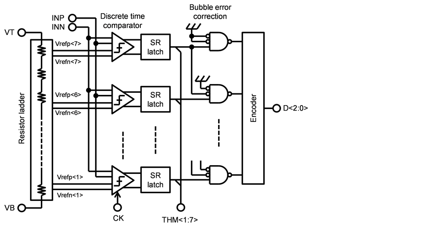 A block diagram of the 3-bit flash ADC is shown in Figure 5. The flash ADC is composed of a resistor ladder, the discrete time comparators, the set-reset (SR) latches, the bubble-error-correction circuit, and the encoder. The resistor ladder generates the reference voltages Vrefp < 1:7> and Vrefn < 1:7>. The differential input signals INP and INN are compared with the reference voltages by the discrete time comparators and the thermometer code THM <1:7>