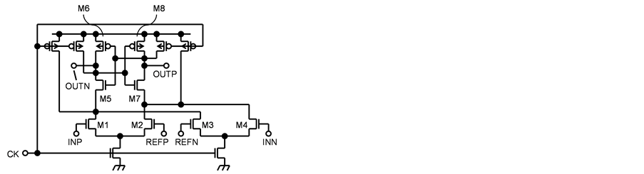 A schematic of the discrete time comparator is shown in Figure 6. A comparator known as a Strong ARM latch, which enables the high-speed operation and the low-power consumption, is used. The voltage difference between the input signal and the reference voltage is converted into the differential current by the clocked differential pair (M1 - M4), then the current flows from the latch circuit (M5 - M8). The latch circuit determines the polarity of the voltage difference between the input signal and the reference voltage, and provides the polarity at OUTP and OUTN.
