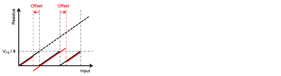 No offset calibration technique is used for the comparator because the area of the calibration circuit is often considerably large. The range overlapping technique [13] is used instead. The offset voltage of the comparator affects the residue generation as shown in Figure 6. The residue is in the range from 0 to VFS/8 when the comparator has no offset, where VFS is the input full scale range. However, the residue exceeds VFS/8 when the comparator has a positive offset. On the contrary, the residue has a negative value when the comparator has a negative offset. Therefore, the TDC should cover more than VFS/8. The input range of the TDC is extended to VFS/4 and has 6-bit resolution in this implementation.