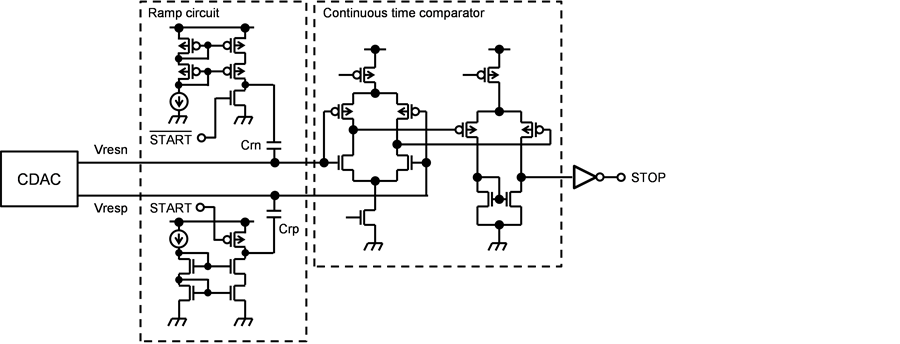 The CT-CMP detects a cross point of Vresp and Vresn. Its output (STOP) rises when Vresp becomes lower than Vresn. The time between START and STOP is proportional to Vresp - Vresn; therefore, the voltage signal can be converted into the time signal. The CT-CMP is composed of a two-stage amplifier. The first stage is a high-gain differential inverter amplifier, and the second stage is a current-mirror-loaded pMOS differential amplifier. The high gain of the first stage successfully reduces the input referred noise to 5 nV/√Hz.