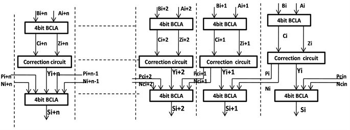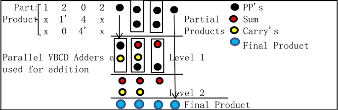 Figure 4 shows the pictorial representation of addition of partial products with their intermediate sum and carry bits of various levels to get their final product using VBCD parallel Adders [26] .