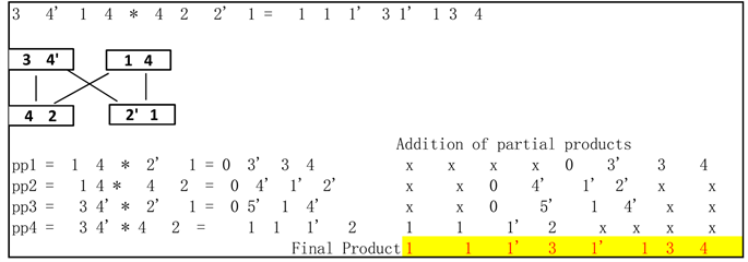 The above figure shows an example of 4 digit BCD multiplication using vertical cross wire method only by divide and conquer method. In this each digit is subdivided into 2 digits and multiplication is performed as shown in above figure.
