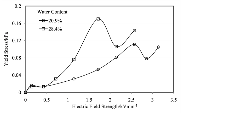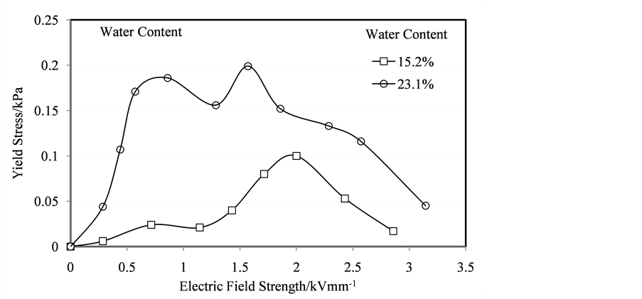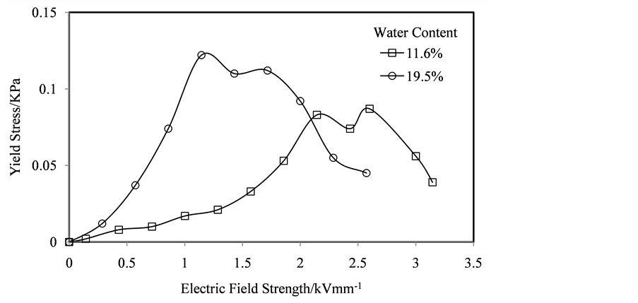 tric fields as the water content increases, a similar effect was observed by Deinega and Vinogradov [10] for the studies of the influence of hydration of disperse phase in hydrocarbon phase on ERE. In their plot of stress versus water content, they observed that as moisture content increased, the ERE increased, reached a maximum and then fell sharply; the maximum grew and moved towards smaller humidity values. The results here also confirm that the more the electric field was applied, the yield stress dropped. The positions of the maxima and shifts due to water content are given in Table 1. Although estimates were made, it is, however, incorrect to determine and compare the maxima and shifts using electric field values because the curves are non-symmetrical, broad and have fluctuations. It was not possible to determine how much the yield stress increased with