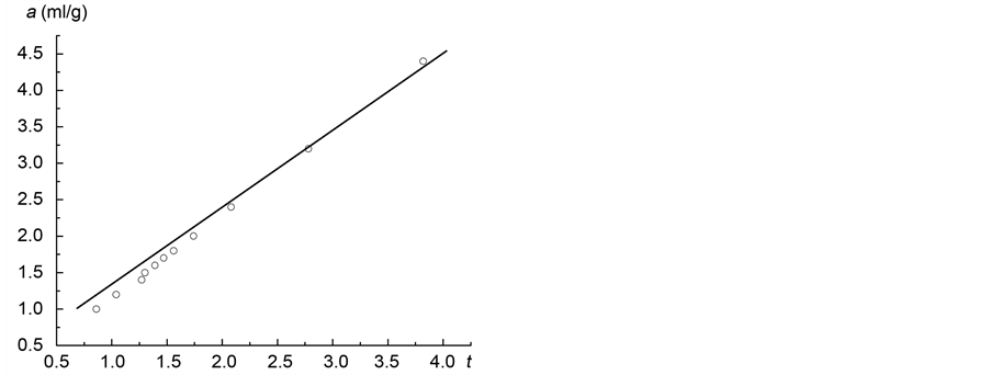 An analysis of the adsorption isotherm is conveniently carried out on basis of the t-plot. On the basis of the t-plot the adsorbed amount is shown on the ordinate axis and the thickness (t) of the adsorption film on the abscissa axis [14] . Figure 2 shows a t-plot of the adsorption isotherm. In a range of the value of the adsorbate relative pressure 0.6 < x < 0.95 (t > 1.5) the adsorption film is stable and t-plot is accordingly linear.