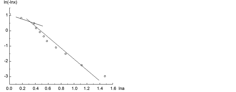 Now consider the determination of the fractal dimension of the carbon sample by nitrogen adsorption (Figure 1). BET value was determined as aT = 1.15 ml/g. The adsorption in micropores takes place in the interval 1.15 ml/g < a ≤ 1.84 ml/g, which corresponds to a pressure range of 0.1 < x < 0.6, with x = p/p0.