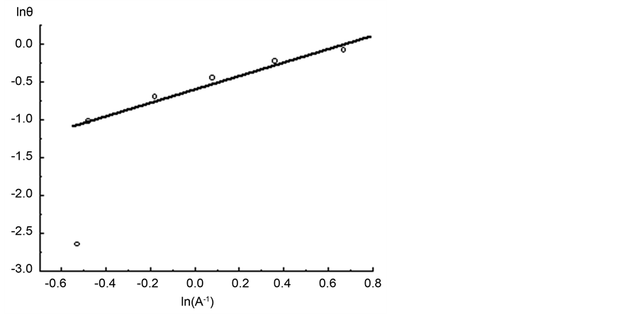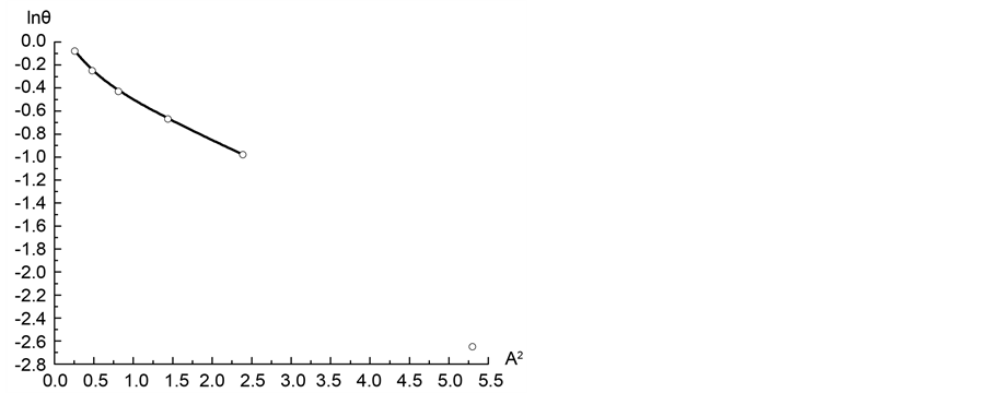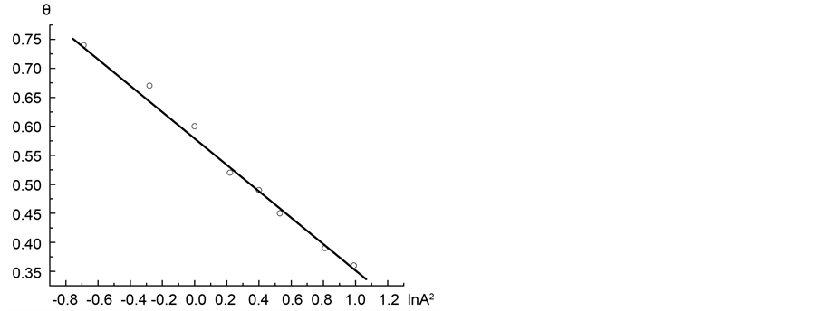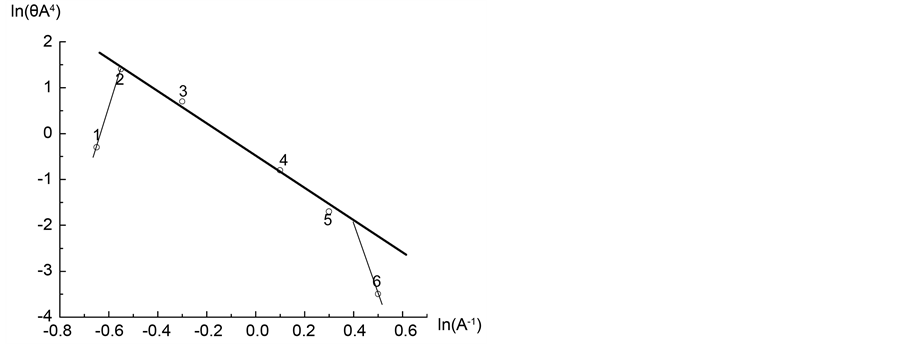 behaviour of the adsorption system with x = 0.1 (the leftmost point (1) in Figure 4) and x = 0.6 (the rightmost point (6) in Figure 4). A straight line is found for the region of 0.1 < x < 0.6, which corresponds to 0.072 < θ ≤ 0.94. The point (θ = 0.072; x = 0.1) is not a point of the straight line, built by Equation (18). Therefore, near x = 0.1, the quantity D takes a negative value, since in a close vicinity of x = 0.1, θ = 0.072 cannot be considered on the basis of the fundamental theory VFM. In this area there is a logarithmic divergent behavior of the adsorption potential energy of the system [14] . For the region (θ > 0.94; x < 0.6) of the isotherm in coordinates of (18) the slope of the straight line is much greater than of the isotherm with a plot interval 0.072 < θ ≤ 0.94. In the vicinity of this point the value of D is greater than 3. Therefore, calculations of the fractal dimension D in the vicinity of θ = 0.07 and θ = 0.94, based on the formalism of TVFM, is incorrect. Thus, the proposed method for calculation of the fractal dimension D, based on the solution of the integral (3) is strictly valid for 0.1 ≤ θ ≤ 0.9. Using formula (9), the value of D is calculated to 2.47.