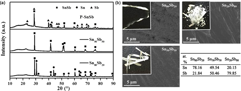 The melt-spun SnSb alloy ribbons with Sn:Sb molar ratio of 80:20, 50:50 and 20:80 were characterized by X-ray diffraction (XRD). As shown in Figure 1(a), the sharp diffraction peaks attest the crystallinity of the alloy ribbons while the absence of any oxide impurities is also confirmed from the diffraction pattern. The characteristic diffraction peaks of the Sn80Sb20 ribbon correspond to rhombohedral β-SnSb phase (JCPDS card no. 33-0118) and tetragonal α-Sn phase (JCPDS card no. 04-0673), respectively. Meanwhile, the XRD patterns of Sn20Sb80 ribbon are identified as rhombohedral β-SnSb phase and rhombohedral α-Sb phase (JCPDS card no. 35-0732), while a single β-SnSb phase is recognized for the Sn50Sb50 one. Next, we examined the surface topography and composition of the alloy ribbons. Although the dimension of SnSb ribbons with different molar ratio are not the same, as the digital images show, all the as-obtained ribbons displayed the smooth surface without aggregated particles or voids in SEM (Figure 1(b)). That should be thanks to such high cooling speed of the melt-spinning technique effectively stop further grain growth that usually induces segregation. The quantitative elemental analysis of EDS reveals that the compositions of as-obtained alloy ribbons are well in agreement with the nominal compositions.