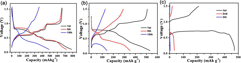 galvanostatic discharge/charge tests at a current density of 100 mA g−1 between 0.1 and 1.5 V. According to the typical charge-discharge profiles (Figure 2(a)), the P-Sn80Sb20 delivered a lithium capacity of ~780 mAh g−1 for the first cycle with initial coulombic efficiency of 99% while P-Sn50Sb50 and P-Sn20Sb80 did ~530 mAh g−1 and ~470 mAh g−1 (Figure 2(b), Figure 2(c)) respectively. After 10 cycles, P-Sn80Sb20 retained a capacity of ~470 mAh g−1, which was much superior to the ~150 mAh g−1 of Sn50Sb50. As to P-Sn20Sb80, its initial coulombic efficiency was just 44.8% and the dramatic capacity degradation happened at the second cycle when the capacity jumped to ~34 mAh g−1. In addition, lithiation/delithiation reaction of P-Sn80Sb20 occurred between a narrow voltage range of 0.1 - 1.0 V, delivering capacity evenly with a stepwise characteristic, while the other two did inferiorly. So, the Sn80Sb20 one was supposed deserving the further dealloying treatment.