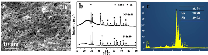 Figure 3. (a) The SEM images of the as-obtained NP-SnSb ribbon; (b) The XRD pattern of the ribbons before and after dealloying; (c) The EDS results of the NP-SnSb ribbon.