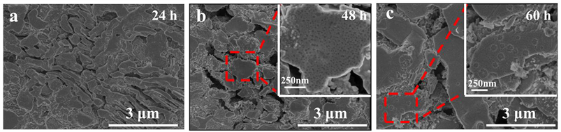 Figure 4 shows the morphology evolution of SnSb ribbon during the dealloying process. It can be seen that river pattern cracks appeared as the etching time reached 24 hours (Figure 4(a)), then bunch of pinpoint holes generated between cracks after 48 hours (Figure 4(b)), and bigger holes showed up among the smaller ones when the total time was 60 hours (Figure 4(c)). It is certain that the morphology of alloy ribbon changed as the etching time increased and regulated pores does not form until the etching time was up to 72 hours.