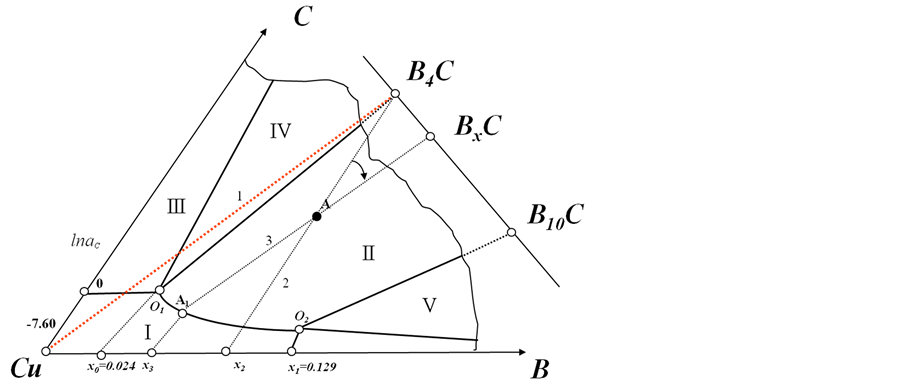 atomic fraction [21] ) and no carbide phase is present in this system. The Cu-B system displays a eutectic reaction at 13.3 at% and 1013˚C. The boron solubility in liquid Cu at 1200˚C (1473 K) is about 25 at%. [22] . Since no stable ternary phase in the Cu-B-C system has been reported, an isothermal section for this system may be constructed, as shown in Figure 1. The phase equilibrium regions are denoted by Roman numerals: I-single phase region of the Cu-B-C liquid solution (L.S.); II-two-phase region of L.S. with boron carbide of various compositions; III-two-phase region of L.S. + graphite; IV-three-phase region with L.S., corresponding to Point O1, + graphite + B4C; V-three-phase region of L.S., corresponding to Point O2, + B10C + boron, saturated with Cu; VI-two-phase region with L.S., corresponding to Point O2, + boron, saturated with Cu. Point O1 cor- responds to the three-phase equilibrium of the liquid solution