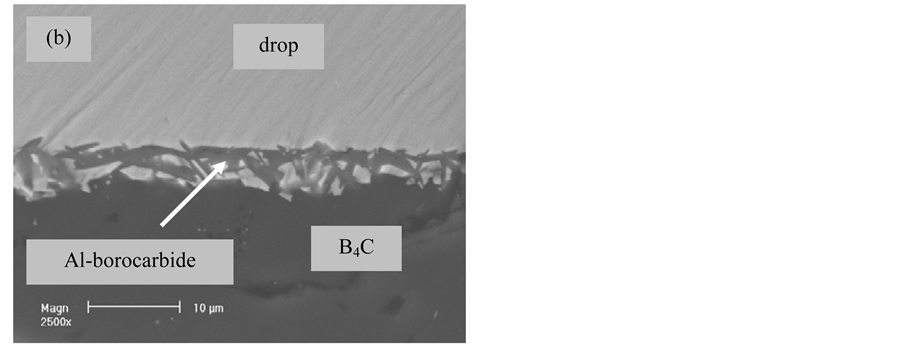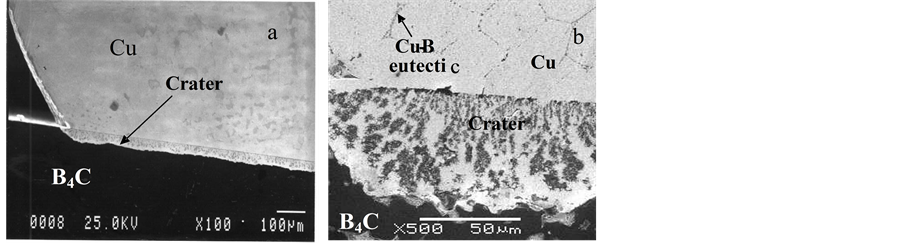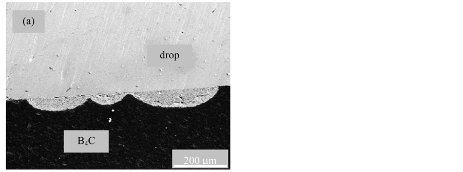 A high contact angle close to 110˚ was observed for Cu on B4C substrate at 1423 K, after 30 min contact (Fig- ure 2(a)). As the result of the interaction of molten copper with the substrate, carbon is released from the car- bide and forms a very thin surface layer located at the initial substrate-metal interface. Below that layer, a crater forms, and as it deepens additional carbon is released to form agglomerates dispersed in the molten metal con- tained within the volume of the crater (Figure 2(b)). It has also been established that boron addition to liquid Cu prevents the formation of a crater and leads to improved spreading.