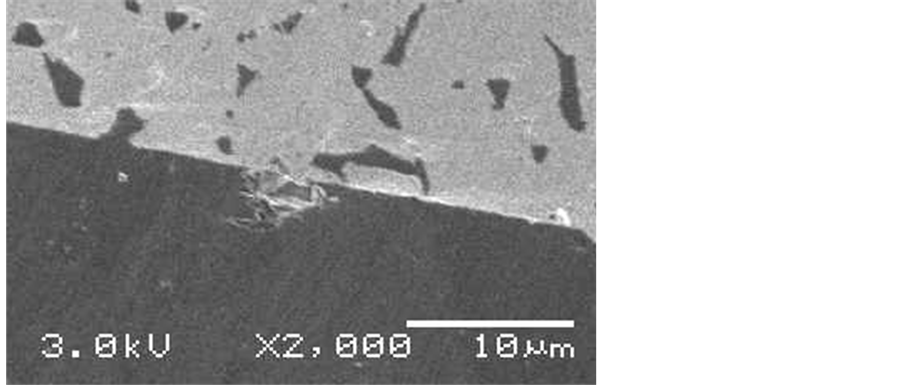 , XSi » 0.15). The spreading mechanism was not explained but an attempt towards un- derstanding closely related phenomena was made by Rado et al. [11] , who investigated the wetting properties of the Ag and SiC/(Ag-Si) systems. They found that a silver-rich Ag-Si alloy doesn’t react with SiC but wets it fairly well (40˚ contact angle). They suggested that this behavior is not due to adsorption of Si at the liquid met- al/SiC interface but rather to direct bonding between Ag and SiC, implying that chemical bonds exist at the in- terface.