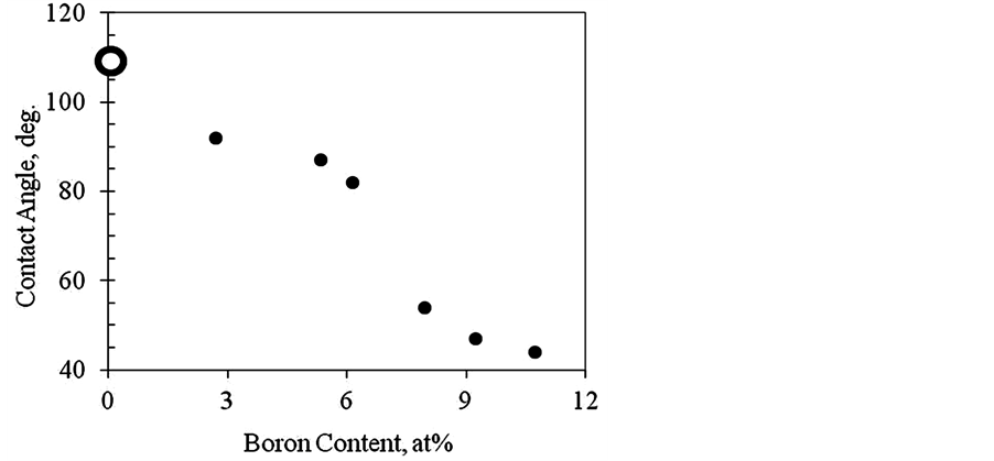It has been established that boron addition (above 2.8 at%) to liquid Cu prevents the formation of a crater and leads to improved wetting (Figure 3) [24] . Figure 4 shows that experimental results are in good agreement with the thermodynamic calculations shown above. The contact angle observed is the macroscopic contact angle. Pure Cu in contact with B4C dissolves the substrate (Figure 2) and destroys the flat interface that is mandatory for the validity of the Young-Dupré equation [25] [26] and to the classical meaning of the contact angle. There- fore this result was marked differently.