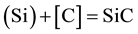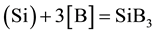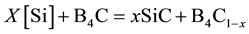 sion describes the actual reaction, it is not possible to derive the equilibrium parameters because the standard formation energies for B4C1−x are unknown. In order to overcome this obstacle a different approach was used. For a thermodynamic analysis of SiC being formed by carbon that originated in non-stoichiometric boron car- bide and SiB3 being formed from B and Si dissolved in liquid Cu, the chemical reactions considered are: