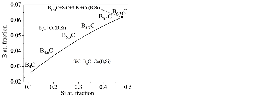 , boron carbide is in two-phase equilibrium with SiC or in three-phase equilibrium with Si and SiC. Only at lower carbon content does silicon boride SiB3 appear and coexist with boron carbide B6.6C. Since copper does not form compounds with either carbon or boron, it may be considered as a diluting agent of silicon, which decreases the silicon activity. In the case of the Cu-B-C-Si system, the reaction between boron carbide and the dissolved Si in molten copper may be expressed as:
