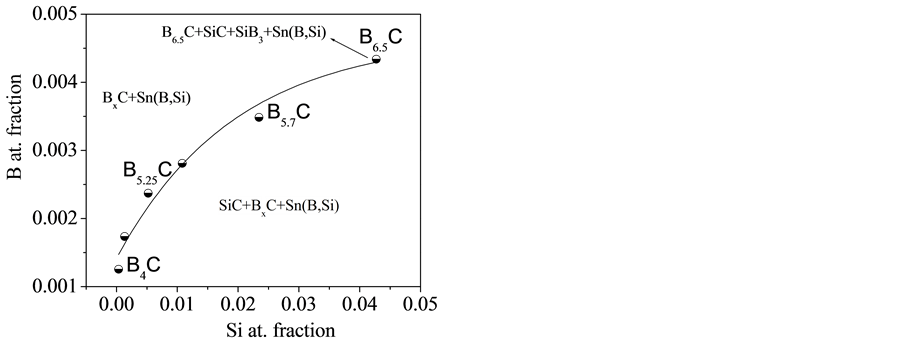 A calculated isothermal section of the Si-B-C system at 1400 K has been published by Seifert [28] (Figure 5). Over its high carbon content range, namely BxC with