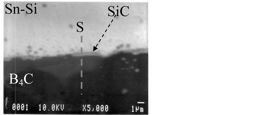 Figure 8. The interface of B4C and Sn-8 at% Si melt (after 90 min at 1423 K), a thin continuous SiC layer was formed.