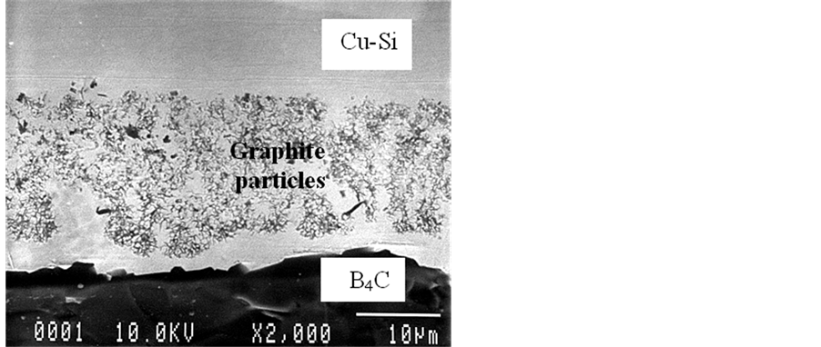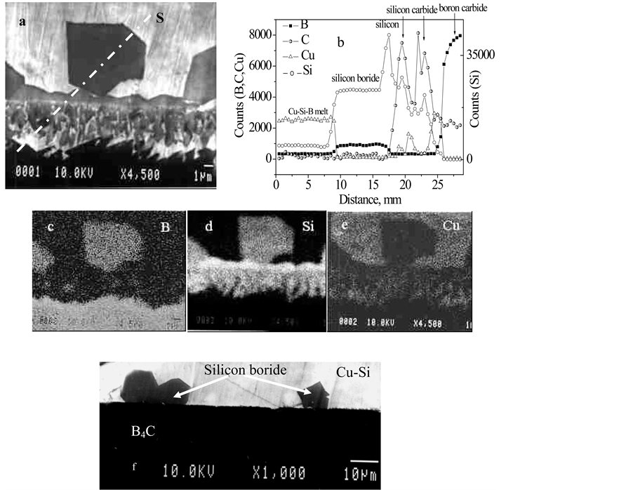 EDS and WDS quantitative analysis confirm that the interface particles are SiC. It is important to point out that at the first stages of the interaction, when the silicon carbide particles were already formed, the contact an- gle is greater than 90˚. Qualitative line scans (Figure 11(b)) show that a silicon layer covers large portions of the composite SiC-Cu layer. This layer, which lies on the liquid side of the initial interface, formed during the solidification of the molten metal drop and can be attributed to the decreased solubility of Si in molten Cu-Si al- loy with decreasing temperature. At several locations, relatively large SiB3 particles were detected contiguous to the solid, whether Si (Figure 11) or initial B4C, as shown below. These particles apparently nucleated in the course of the melt cooling and provide unambiguous proof of the presence of a significant boron concentration within the melt. The crater that was formed within the boron carbide substrate consists of SiC particles with en- trapped pockets of the Cu-Si-B melt, reminiscent of that of the carbon agglomerates shown in Figure 2(b) and Figure 9. The presence of silicon boride particles, which were formed during solidification and are contiguous to the flat interface (Figure 11(f)), further confirm the enrichment of the melt by boron. The line scan and map- pings underline the complex nature of the molten alloy-boron cabide interface after solidification. Going from the molten Cu-alloy melt towards the substrate, this consists of heterogeneously nucleated silicon boride par- ticles and a quasi-continuous Si layer, both formed during the solidification of the molten alloy due to the great- ly reduced solubility of B and Si in solid Cu. At the initial (prior to crater formation) molten metal boron carbide interface, a quasi-continuous SiC layer is present. The crater volume is filled with additional SiC intermixed with entrapped pockets of solidified Cu-Si-B alloy, with most of the latter adjacent to the roughened boron car- bide substrate surface.