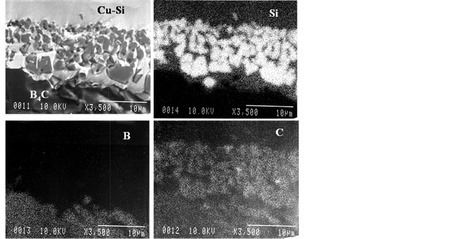 Figure 10. SEM and X-ray mapping images at the B4C/(Cu-15 at% Si) inter- face after 90 min at 1423 K.