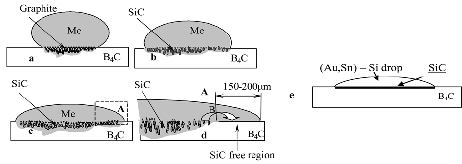 Figure 12. The interaction stages at the boron carbide and Cu-Si melt interface (a-d). (e) The interaction and wetting be- tween boron carbide and (Au, Sn-Si) melt alloys is due to direct wetting of the SiC layer formed at the boron carbide-melt interface.