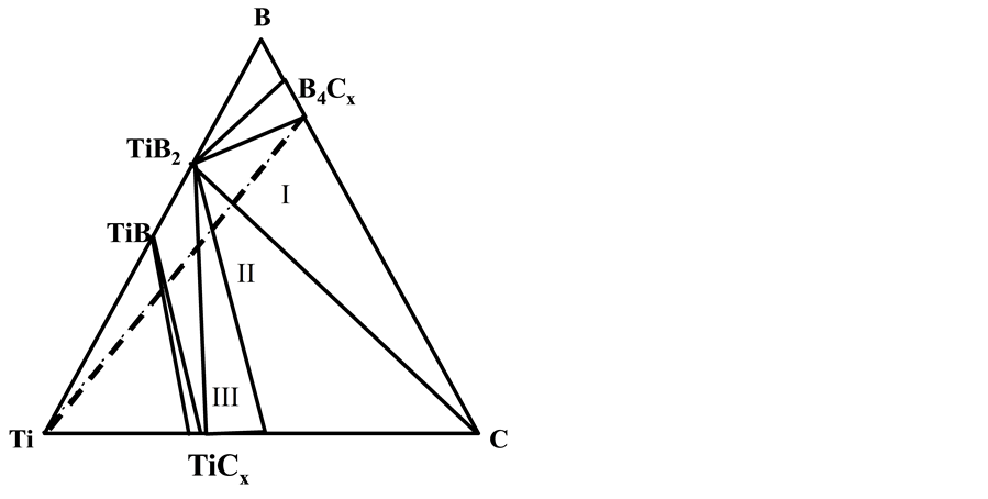 the point corresponding to boron carbide. Each point on this line defines the relative amounts of the phases that are in equilibrium. At a low Ti/B4C mass ratio, the system is in the three-phase Region (I) TiB2 + graphite + B4C. Thus, TiB2 and graphite are the first phases that are formed at the boron carbide/titanium interface. The forma- tion of the TiC phase takes place only when boron carbide is consumed (or there is no direct contact between melt and substrate) and carbide is in equilibrium with TiB2 and graphite (Region II). At higher Ti content (or if the released free carbon is completely consumed), the conditions for TiB2 coexisting with non-stoichiometric tita- nium carbide phase (TiCx) may be achieved (Region III).