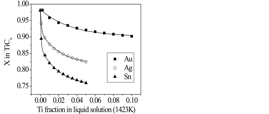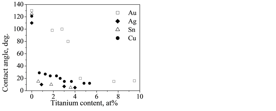 carbide may change its composition in accordance with the activity of titanium in the melt. At the triple line, the observed spreading angle corresponds to that determined by the contact between TiCx and the Me-Ti melt. The wetting of TiCx by non-reactive metals like Au, Ag, and Sn is affected significantly by the Ti/C ratio (the contact angle decreases with decreasing x value [33] . The detailed thermodynamic calculation was performed in [34] . The calculated titanium carbide compositions (x in TiCx) as a function of the Ti content in the different Me-Ti liquid solutions are shown in Figure 18. At equal titanium concentration, the lowest x value is associated with the Sn-Ti liquid solution and the highest with the Au-Ti melt. These results are consistent with the level of the negative departure the liquid solutions form ideally. The activity of titanium in the Au-Ti melt is significantly lower than in the Sn-Ti and Ag-Ti liquid solutions [35] - [37] . As mentioned, the equilibrium contact angle decreases with decreasing value of x and it is clear that for the same value of the contact angle, the titanium con- centration in liquid Au has to be significantly higher than in liquid Sn and Ag. The results of the thermodynamic analysis are in a good agreement with the experimental results (Figure 14).