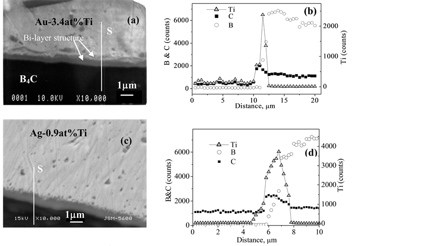 According to the SEM analysis, the interface structures in the B4C/(Sn-Ti), B4C/(Ag-Ti), and B4C/(Au-Ti) systems were similar. In all these systems, a very thin bi-layered structure was observed between the substrate and the metal drop (for Au-3.4 at% Ti alloy and Ag-0.9 at% Ti alloy, Figure 15(a) & Figure 15(c)). Qualitative WDS scan (Figure 15(b) & Figure 15(d)) shows that the first layer, adjacent to B4C, contains Ti and B, while the second layer contains Ti and C. On approaching the triple line, the thickness of the reaction product layers decreases continuously down to about 0.1 μm, as shown for the B4C/(Ag-Ti) system (Ag-0.9 at% Ti alloy, Fig- ure 16).