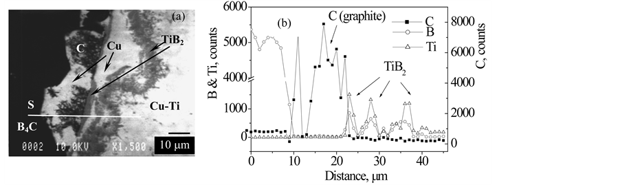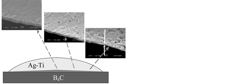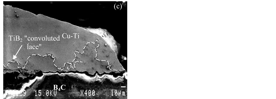 There is a resemblance between the B4C/Cu Cu-Ti systems, and B4C/Ni, Ni-Ti systems, which were studied by Lin & Sui [4] [5] . Molten Ni dissolves boron carbide but improved wetting isn’t obtained. The addition of Ti reduces the contact angle due to the formation of TiB2 at the substrate/molten drop interface.