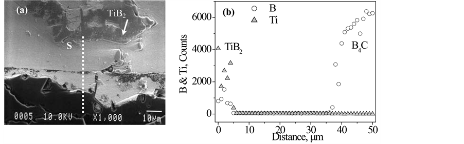 Figure 19. Titanium distribution between the TiB2 convoluted “lace” and the B4C substrate, SEM micrograph (a); WDS line scan (b) showing that the Ti concentration between TiB2 and B4C is practically zero.