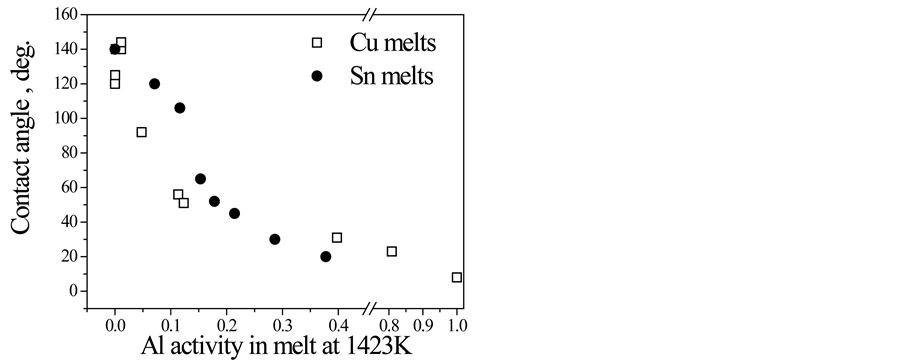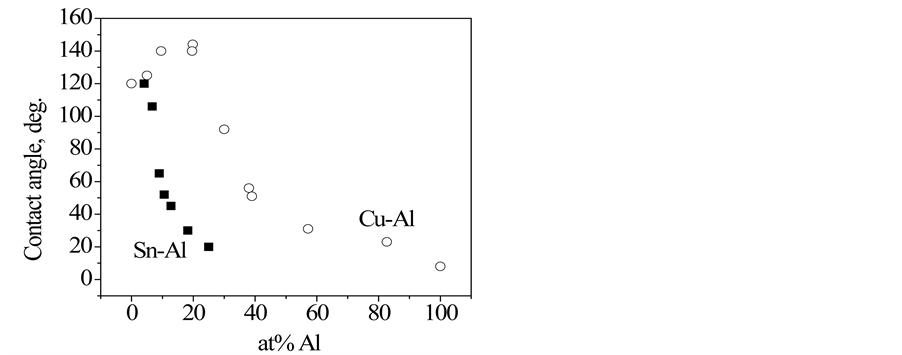 According to the experimental observations, the wetting behavior in both the B4C/(Sn-Al) and B4C/(Cu-Al) sys- tems is controlled by the formation of the ternary carbide phase at the interface. However, the effect of alumi- num additions for the B4C/(Sn-Al) system is stronger than for the B4C/(Cu-Al) system. The reason for these dif- ferences may be accounted for by thermodynamic properties of the Cu-Al and Sn-Al alloys. It was established that the Cu-Al liquid solution displays a negative departure from ideality, while for the Sn-Al liquid solution this departure is positive [39] [40] . A dominant effect of the thermodynamic properties of the alloys on the wetting behavior is illustrated in Figure 22 where the equilibrium contact angle is plotted as a function of aluminum ac- tivity.