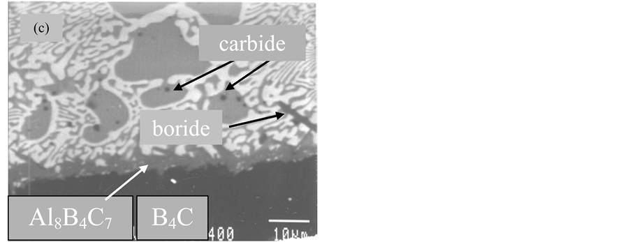 Figure 21. The B4C/Cu-Al interface structure. Cu-19 at% Al (a); Cu-40 at% Al (b); Cu-83 at% Al (c). The reaction product at the interface was identified as Al8B4C7. Aluminum carbide and boride inclusions were detected in the solidified drop with high Al contents.