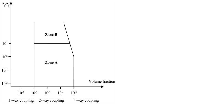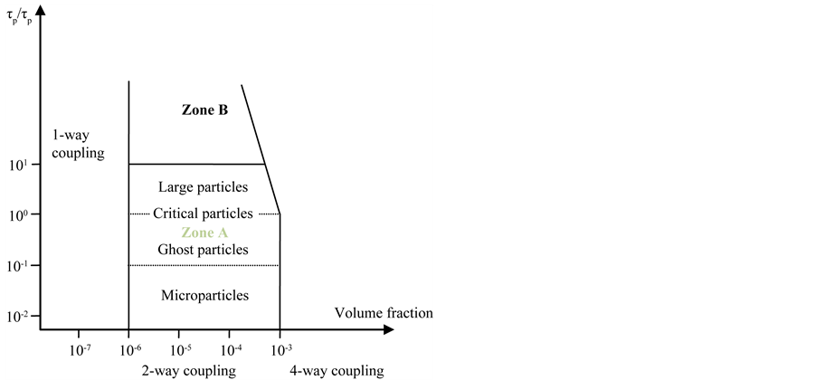 is the carrier phase time scale. For St less than unity the particles just follow the streamlines while for St larger than one the particles detach from the flow. For particles of St ≈ 1, St can be used to describe the alteration of the carrier phase turbulence. For small particles dp ~ η, observations yield an increases in the rate of TKE dissipation and a corresponding reduction of turbulence for St = O(1) ~ O(10), hence the particles extract the turbulent energy from the flow and dissipate it. Elgobashi et al. [19] used a two-way coupling approach to study the TKE production and dissipation for a system with small spherical particle, Rep ≤ 1 and St based on the Kolmogorov time scale τη ≈ O(10−2) to O(101). The aim was to update previous results, especially regarding small particles, Zone A in Figure 1, and they found that TKE and its dissipation rate ԑ are function of St. Luo Fan et al. [20] studied a two phase solid-gas jet flow by developing a DNS technique with a two-way coupling method at moderate Re and St = 0.01, 1 and 50. They found attenuation in TKE for the cases that were studied.