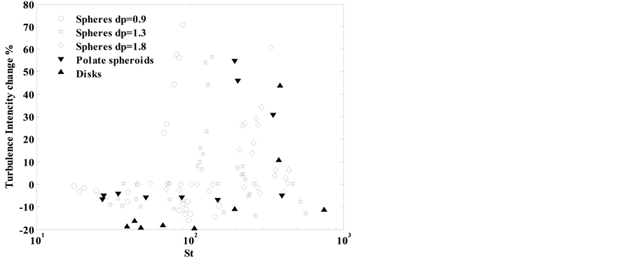 The particles will not be able to follow the motion of smaller eddies perfectly as their size increases and they will follow eddies of larger scale, more frequency [21] . Larger particles lead to increase in TKE, as detected by [22] . The reason to this may be vortex shedding behind the particle. For very high St or particles with diameter around the Taylor length scale, St cannot be used to describe the characteristics of the turbulent modification [23] -[25] . The particle relaxation time definition based on the analytical solution of Stokes equation for creeping flow (for particle falling from rest in stagnant fluid) can be safely applied to small particles of dp ~ η following the Kolmogorov theorem, Reη ~1. For larger particles inertia becomes important and the carrying phase has no obvious influence on the motion of the particles [26] . In this region, where inertia is significant, the assumptions, Reη ~1, for which relaxation time scales have been derived is no longer valid. Mandø [17] investigated particles with St = 10 - 1000. For 10 < St < 60, the turbulent intensity TI is attenuated or stay unchanged as shown in Figure 2. Increasing St over 60 may however result in as well amplification as attenuation of TI and notice that the attenuation can be substantial. Based on a review, Tanaka and Eaton [18] could not find any trend for turbulent modification that is independent on the fluid studied, as shown in Figure 3.