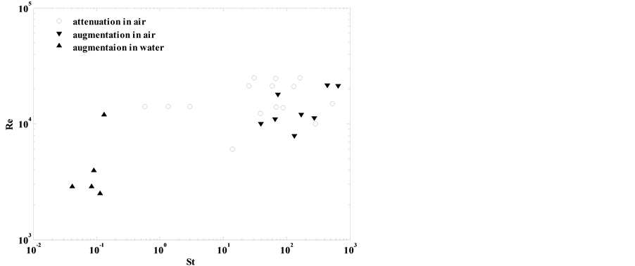 Figure 3. Turbulent modulation as function of St and Re for air and water [18] .