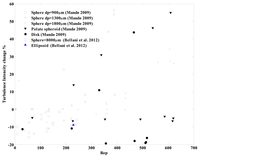 is the ratio of fluid inertia fluid viscosity and Rep can be identified as the ratio of inertia to viscosity in the fluid close to the surface of the particle. Rep decides the nature of the flow around a particle, the type of boundary layer around the particle (laminar or turbulent) and the occurrence of vortex shedding. In general, studies yield turbulent attenuation for low Rep and turbulent amplification for Rep ≥ 400 [28] . The latter may be explained with a transfer of some of the flow kinetic energy into turbulence through vortex shedding. Geiss [28] found significant turbulence production also for Rep less than 400. Mandø [17] measured in most cases a decrease in TI when adding spherical particles of Rep < 200 while for Rep > 400, nearly all measurements on spherical particles gave an amplification in TI, see Figure 4 where the variation in TI is plotted as a function of Rep for spherical and non-spherical particles. Mandø [17] , and the reference therein, argued that wake instability occurs at Rep ≈ 130 and vortex shedding start at Rep ≈ 270, which give the indication that the increase in TI could not be solely because of vortex shedding, otherwise, the lower critical value of vortex shedding formation Rep ≈ 270 would have been the value which distinguishes between increasing and decreasing in