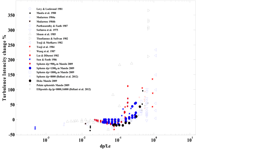 When particles with dp ~ η are added to the flow experiments yield that TKE decreases considerably as compared to a case without particles. This implies that dp/η is an important non-dimensional variable. However, Eaton [29] argued that most experimental works leading to this conclusion have been conducted with velocities in the range of 10 - 50 m/s and with a large length scale in the order of 10 - 50 mm. With the resulting rather narrow Re range it is not clear if it is correct to scale dp with. On the other hand, Eaton concluded that for dp ~ η turbulent eddies may be distorted by individual particles rather than be effected by a cloud of particles. The strong decrease in TKE is thus partly a reflection of local dissipation of turbulence around individual particles. Hwang and Eaton [30] examined isotropic turbulent with no mean flow in a tank with particles where dp ~ η and found attenuation in TKE of as much as 35% - 40%. Mandø [31] and Gore and Crowe [32] reported that it is better to use the ratio of dp to the characteristic length of the most energetic eddy, Le, of the single phase to scale the turbulent modulation. Poelma et al. [33] argued that Le and η have a fixed ratio so these length scales will play the same role. This conclusion was based on experiments with spherical particle in solid-gas, solid-liquid and gas-liquid turbulent upward and downward jet and pipe flow. Gore [32] analyzed about 15 studies in order to categorize the modification of the TI at the central region of the flow with usage of the dp/Le ratio. A critical value of dp/Le ≈ 0.1 was observed, as illustrated in Figure 5, and over this value the relative TI was considerably increased. Gore and Crowe [34] also summarized that with the range of parameters examined there was no large influence of adding particles on Le.