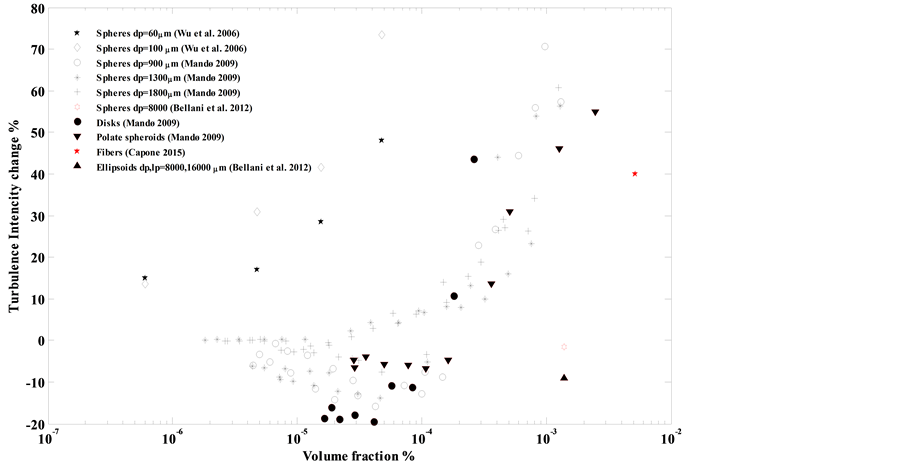 [15] . One result was attenuation in TKE of 3% and 15% for prolate ellipsoidal particles and spherical particles, respectively. A spectral analysis showed that the ellipsoidal particles distributed more TKE to the smaller scales with less energy loss than the spherical particles. Capone [16] injected rod-like particles into a fully developed water jet, which resulted in a significant change in turbulent structure. Mandø [17] investigated turbulence intensity modulation for spheres, discs and prolate ellipsoids. The results indicate that the discs and the prolate spheroids cause more attenuation than the spherical particles. In most of non- spherical particle studies, particles dampen turbulence more than spherical particles and amplify turbulence less than spherical particles. This may partly be related to non-suitable parameters used to compare spherical and non-spherical particles or related to the preferential orientation and rotation of particles that affect the formation of the wake behind the particles. A summary of published results on different types of particles is presented in Table 1.