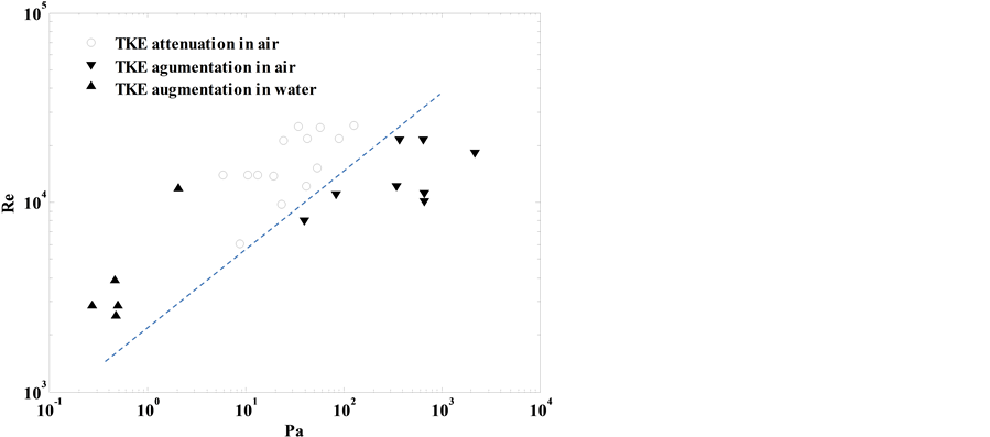 Pa as function of Tanaka and Eaton found that there was augmentation in TKE for Pa < 103 and attenuation for 103 < Pa < 105. Another area of augmentation was found after Pa = 105, as shown in Figure 8. As usually when dealing with St, Tanaka and Eaton derived the particle response time with the assumption of creeping flow which is valid for Re < 1. Lohse [43] had two viewpoints related to the non-monotonic behavior of TKE with Pa and the relation of Pa with St and