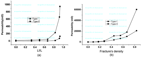 Figure 4. Influences of fracture’s length and density on the absolute permeability. (a) The influences of fracture; (b) The influences of the number of length on absolute permeability fractures on absolute permeability.