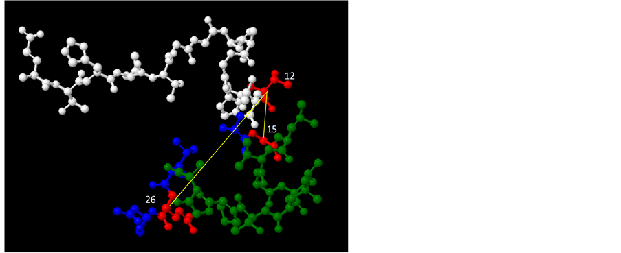 Figure 5. In silico structural 3D model of the HVR1 of HCV H77 isolate. A three dimensional structure of the molecule is shown. Microdomains 1 through 3 of the HVR1 [43] are shown in blue, green and white, respectively. Co-evolving sites 12, 15 and 26 are indicated in red and by yellow lines and their relative positions in the 3D structure are shown. In (a) the predicted structure of the HVR1 is shown in a cartoon style scheme; in (b) amino acids in the molecule are shown by sticks and balls.