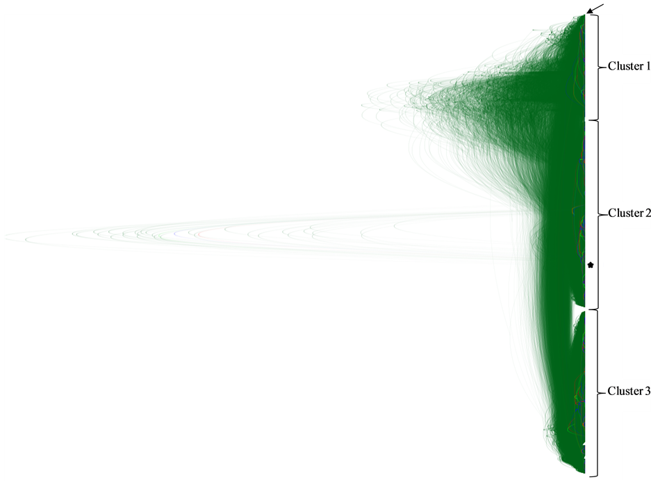 Figure 1. DensiTree phylogenetic tree analysis of HVR1 of E2 genes from HCV quasispecies. Consensus over 20,000 trees is shown. Three clusters depicting different quasispecies sub-populations are indicated by numbers at the right side of the figure. Cluster 1 contains 23 sequences (Seq 1, 2, 13, 14, 17, 19, 23, 31, 39, 40, 44, 45, 55, 58, 59, 60, 61, 63, 64, 75, 77, 89 and 95); Cluster 2 contains 40 sequences (Seq 8, 9, 16, 26, 27, 29, 30, 32, 33, 34, 35, 36, 37, 41, 47, 48, 49, 52, 53, 54, 56, 62, 65, 68, 69, 71, 73, 74, 79, 81, 85, 86, 90, 93, 94, 96, 97, 98, 99, 100) and Cluster 3 contains 37 sequences (Seq 3, 4, 5, 6, 7, 10, 11, 12, 15, 18, 20, 22, 24, 25, 28, 38, 42,43, 46, 50, 51, 57, 66, 67, 70, 72, 75, 76, 78, 80, 82, 83, 84, 87,88, 91, 92). A dominant topology is observed for most of the tree. Inside each sub-population, three alternative interpretations are given, blue for most frequently occurring topology, red for second, and light green for third. The most abundant strain (Seq 1) is shown by an arrow; the less abundant one (Seq 100) is shown by a star.