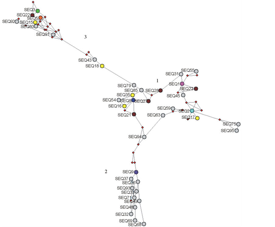 Median-joining network analysis showed that the quasispecies population was composed by three distinct (1-3) subpopulations (see Figure 3). Again, at least two different sub-populations (2 and 3) that accounts for more than 50% of the hayplotypes observed arose in the quasispecies population and are situated in different spaces in the network by comparison with sub-population 1, which contains the master sequence (Figure 3). These results suggest a divergent virus quasispecies population that occupied large extensions of the sequence space [56] .